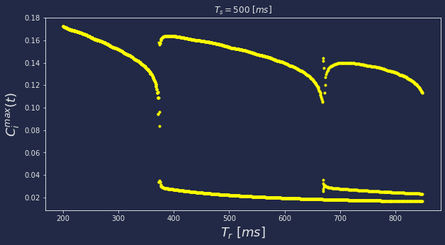 If on the other hand the release is slower due to a malfunction of the calcium release units, which might lead to a slow recovery, the periodic response alternates between a high/low beat to beat calcium release regime. These calcium alternans are a known mechanism for inducing cardiac arrhythmias such as atrial fibrillation. Below I show results for the case of \( T_s=400\ ms \) and \(T_r = 320\ ms \) .