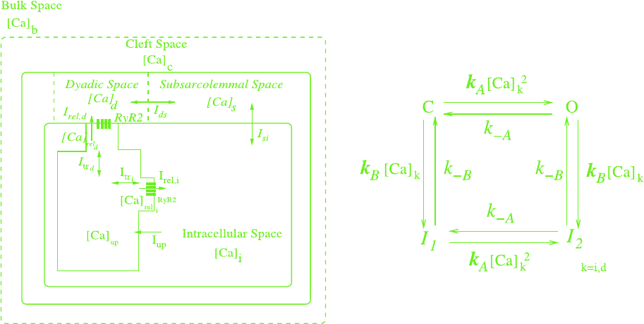 The diagram above shows several cell compartments connected through pumps and gates, as well as the connections of several inner and outer domains of the cell (Left panel). And the dynamics responsible for the calcium cycling, where the Ryanodine receptors (RyR2) states can be found in four configurations or states \( (I_1, I_2, O,C) \). The reciprocal of the activation rate \( \tau_r = \frac{1}{k_B} \) corresponds to the recovery from inactivation time.