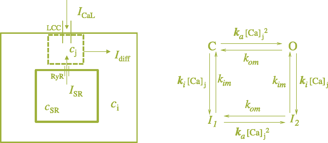 $$\dot{c}_{j} = I_{s}(t)+g_{rel}c_{rel}\frac{k_ac_j^2}{k_{om}+k_ac_j^2}(c_{SR}-c_j) - (c_j-c_o)/\tau_{diff}\quad(1)$$
