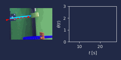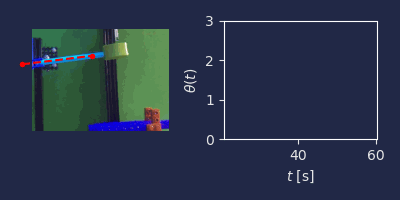 Interactive simulator: The tunable parameters are H: Red bar position, H2: Blue bar position, Xo: Stimulus angle range (white line), km: Fraction of water released, Is: current strength. The plots displayed are the mass present at the right end of the seesaw \( \Delta m (t) \) as well as the angle temporal evolution \( \Phi(t) \). Once a solution is computed the PLAY button shows the rod dynamics simulation.