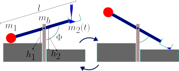 We can see that there are a few parameters which are important, for instance the threshold mass \(m_1 \) which needs to be surpassed by \(m_2\) to move the centre of mass from the quadrant satisfying the constraint \(\Phi_1\) into motion. Another two important parameters are the current \(\alpha\) as well as the fraction of water released mentioned above. We will return to this at the end of the post. For now, let us see the system in action!